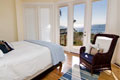 Person liegt im Bett und schaut auf Füße, Waldpanorama im Hintergrund